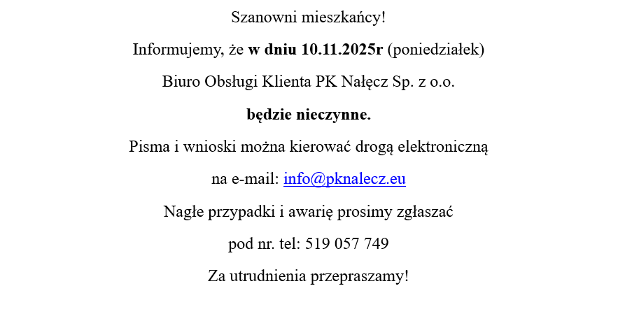 Informacja o nieczynnym Biurze Obsługi Klienta PK Nałęcz Sp. z o.o.Archiwum