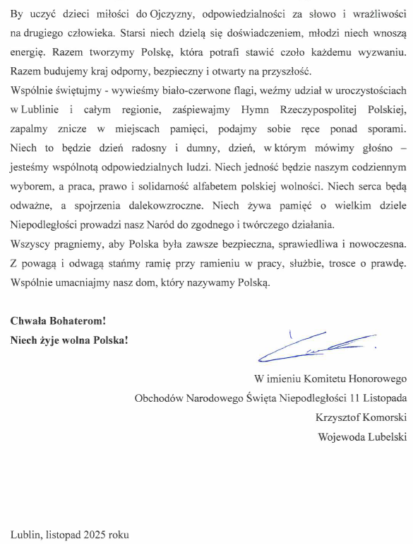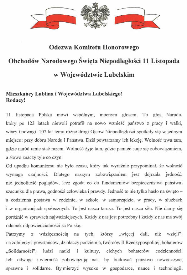 Odezwa Komitetu Honorowego Obchodów Narodowego Święta Niepodległości 11 listopada w Województwie LubelskimArchiwum