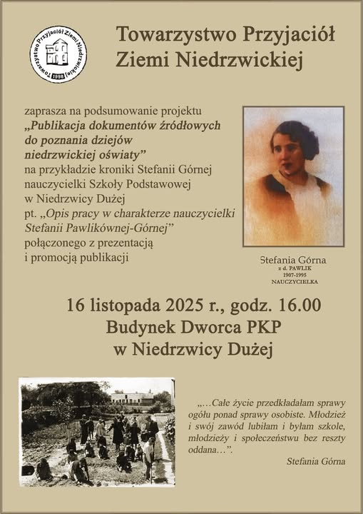 Towarzystwo Przyjaciół Ziemi Niedrzwickiej zaprasza mieszkańców gminy na spotkanie poświęcone podsumowaniu projektu „Publikacja dokumentów źródłowych do poznania dziejów niedrzwickiej oświaty" na przykładzie kroniki Stefanii Górnej, nauczycielki Szkoły Podstawowej w Niedrzwicy Dużej, pt. "Opis pracy w charakterze nauczycielki Stefanii Pawlikównej-Górnej”.