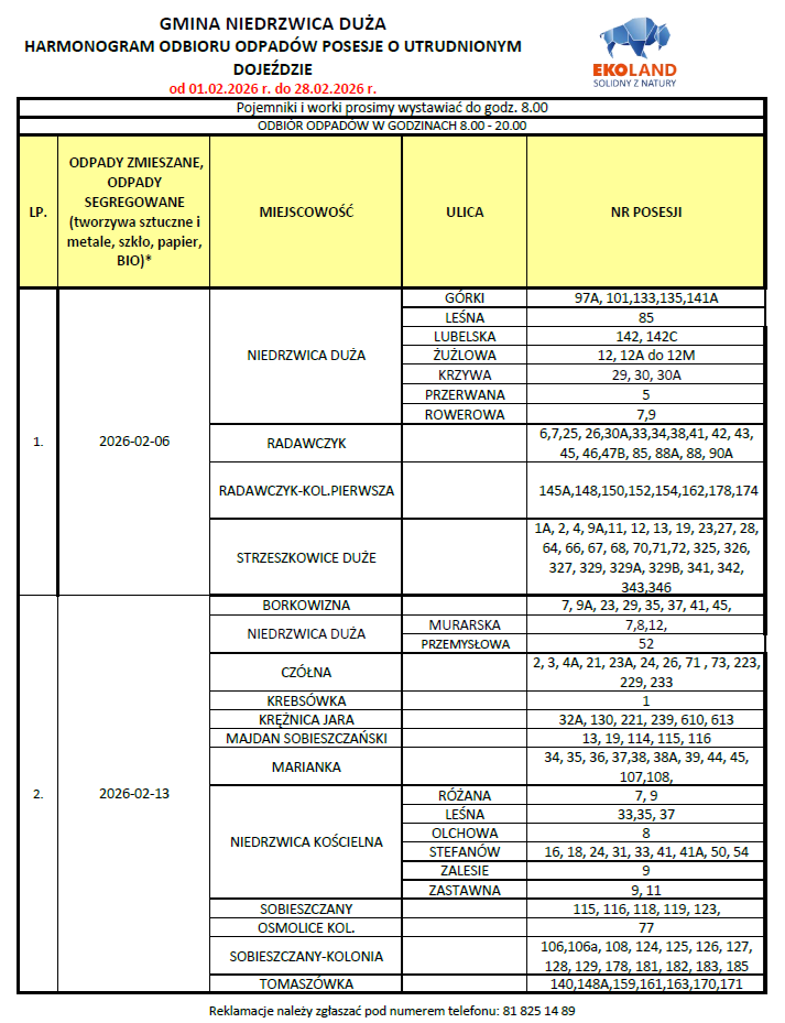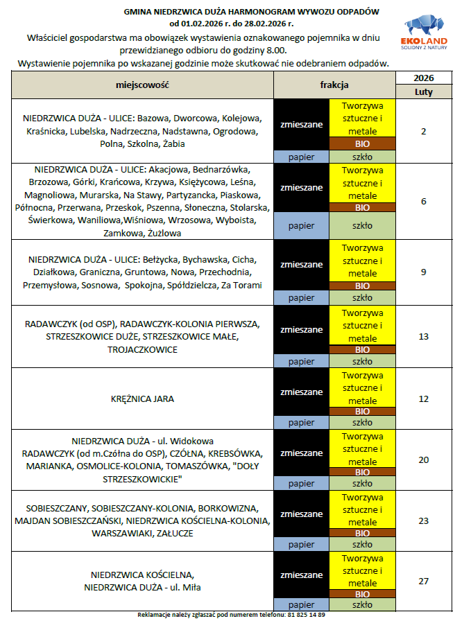 Harmonogram odbioru odpadów komunalnych oraz odpadów zbieranych selektywnie z terenu Gminy Niedrzwica Duża - luty 2026Archiwum