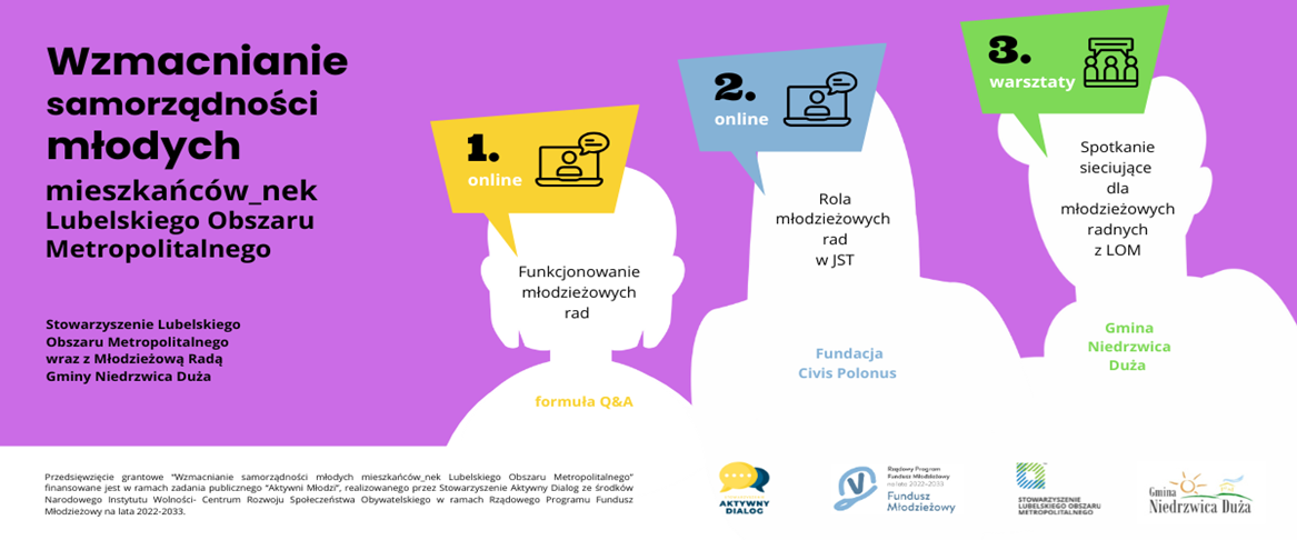 Gmina Niedrzwica Duża i Młodzieżowa Rada Gminy Niedrzwica Duża wraz ze Stowarzyszeniem Lubelskiego Obszaru Metropolitalnego zapraszają do wzięcia udziału w wydarzeniach zaplanowanych w ramach realizacji projektu grantowego „Wzmacnianie samorządności młodych mieszkańców_nek Lubelskiego Obszaru Metropolitalnego". W ramach projektu przewidziany jest szereg aktywności, które dzielić się będą na te dedykowane opiekunom/kom młodzieżowych rad, także tych potencjalnych oraz młodzieży, która współtworzy rady.