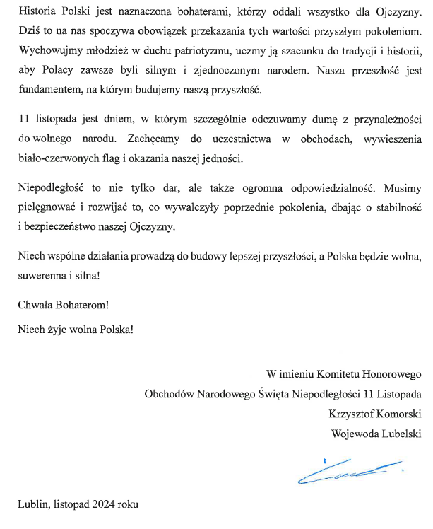 Odezwa Komitetu Honorowego Obchodów Narodowego Święta Niepodległości 11 listopada w Województwie LubelskimArchiwum