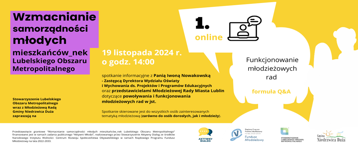Gmina Niedrzwica Duża i Młodzieżowa Rada Gminy Niedrzwica Duża wraz ze Stowarzyszeniem Lubelskiego Obszaru Metropolitalnego zapraszają do wzięcia udziału w pierwszym wydarzeniu zaplanowanym w ramach realizacji projektu grantowego „Wzmacnianie samorządności młodych mieszkańców_nek Lubelskiego Obszaru Metropolitalnego".
