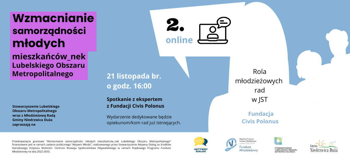 21 listopada br. o godz. 16:00 odbędzie się szkolenie online skierowane do opiekunów młodzieżowych rad funkcjonujących na terenie LOM. Spotkanie poprowadzi ekspert z Fundacji Civis Polonus.