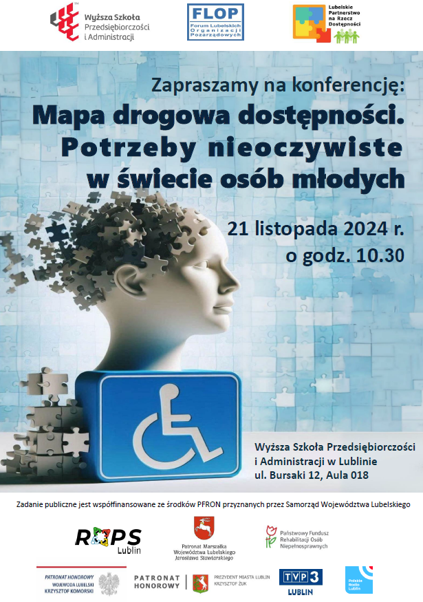 Związek Stowarzyszeń Forum Lubelskich Organizacji Pozarządowych, Wyższa Szkoła Przedsiębiorczości i Administracji w Lublinie oraz Lubelskie Partnerstwo na rzecz Dostępności zapraszają do udziału w konferencji "Mapa drogowa dostępności. Potrzeby nieoczywiste w świecie osób młodych" w dniu 21 listopada 2024 r. (czwartek) o godz. 10.30 w Wyższej Szkole Przedsiębiorczości i Administracji w Lublinie przy ul. Bursaki 12 (Aula 018).