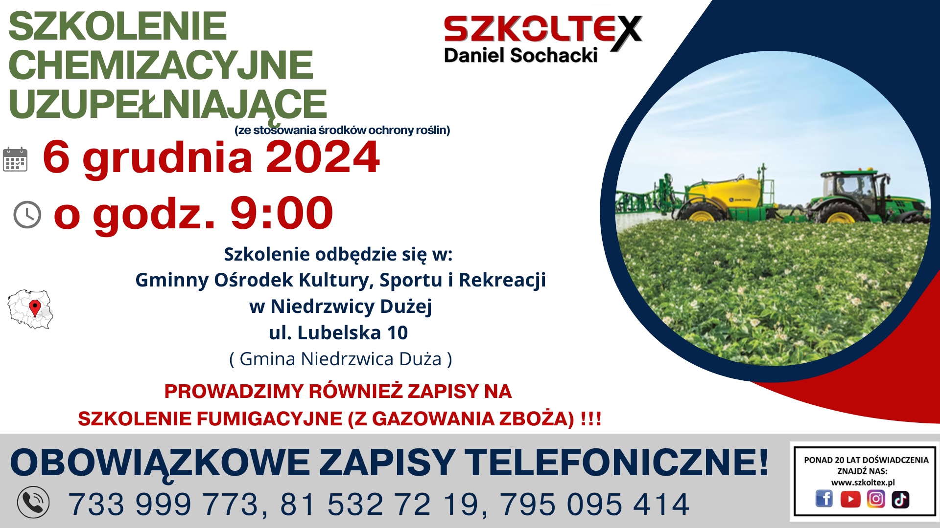 Firma SZKOLTEX organizuje szkolenie skierowane do rolników w zakresie STOSOWANIA ŚRODKÓW OCHRONY ROŚLIN (szkolenia chemizacyjne).