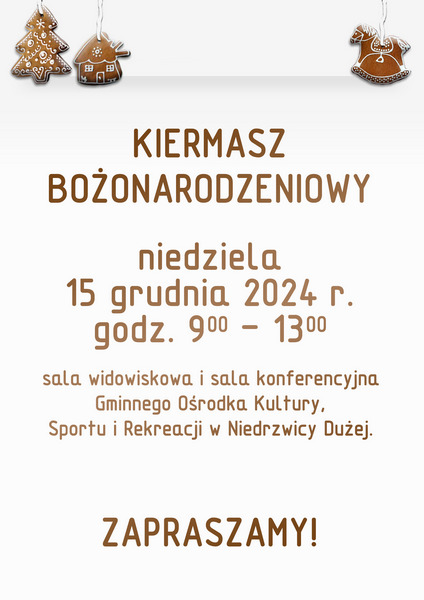 Wraz z Gminnym Ośrodkiem Kultury, Sportu i Rekreacji w Niedrzwicy Dużej (GOKSiR) serdecznie zapraszamy do udziału w Kiermaszu Bożonarodzeniowym, który odbędzie się w niedzielę 15 grudnia 2024 r. w godz. 9:00 – 13:00 w sali widowiskowej GOKSiR.